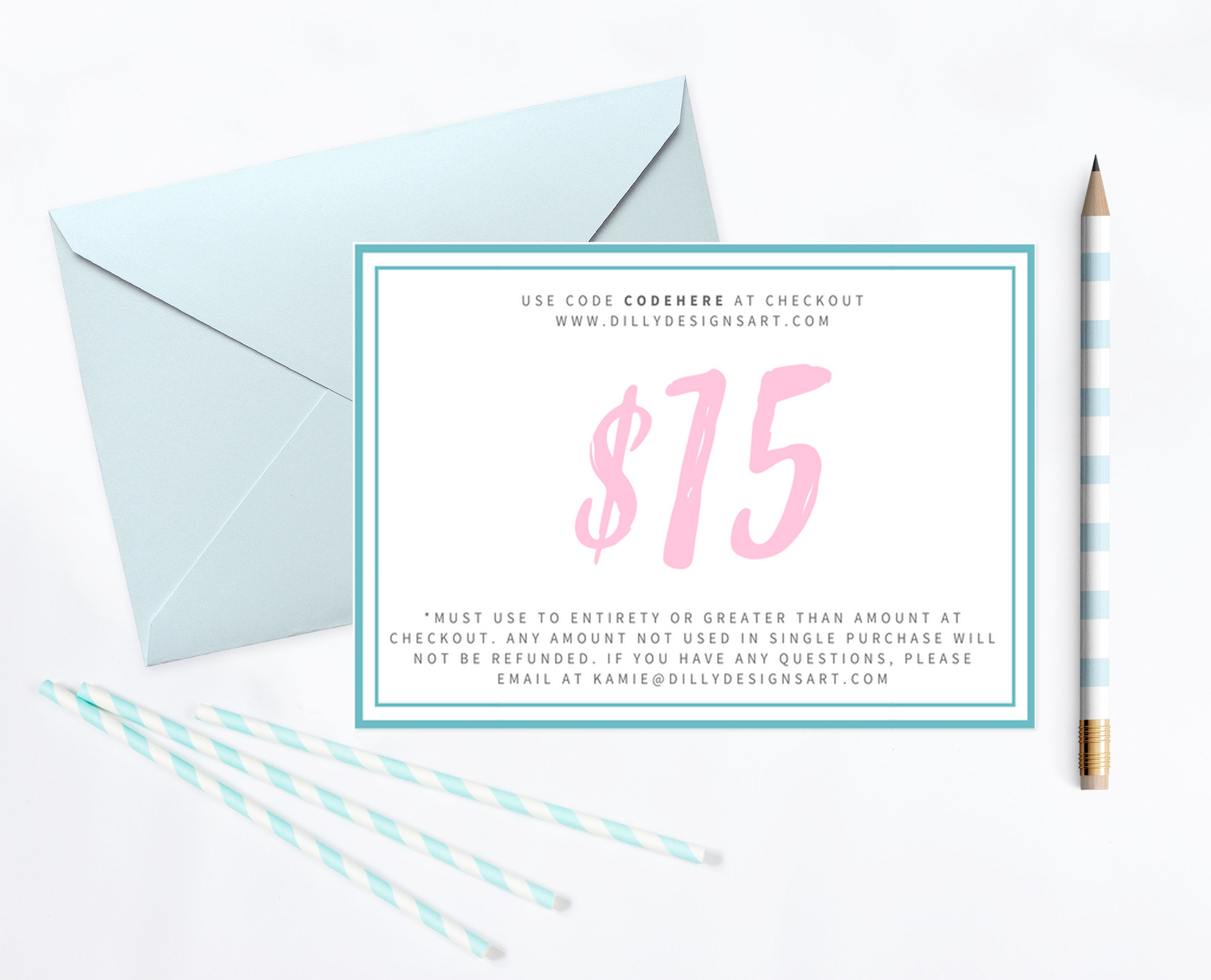 I now offer Dilly Designs Gift Certificates! Nor sure what to get all your loved ones this holiday season? Or do you know they would love some Dilly Designs Art, but not quite sure what which art piece to pick? Or do you think they would love a custom art? This gift is STILL thoughtful and unique- but takes away the headache of trying to figure out exactly what to gift. These gift cards range from $10 - $150! Please contact me if you have any questions. Visit www.dillydesignsart.com and click 'Gift Certificates.'
