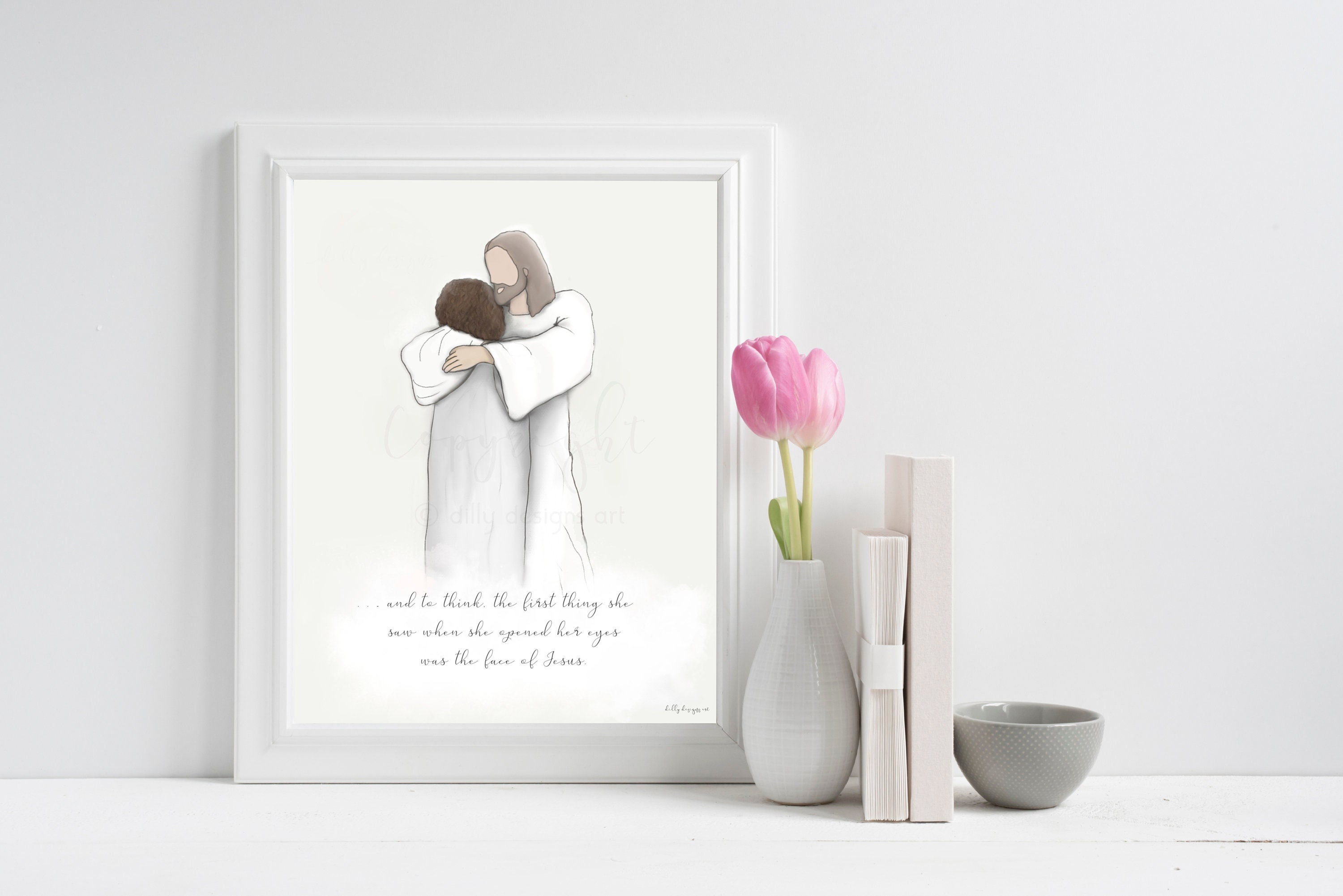 Dilly Designs Art began in 2016 with a Christ and Infant piece that gained quick popularity. More and more people began asking for more comfort pieces that they could give to their friends and loved ones during life's most difficult and heart-wrenching trials. They simply wanted something more to give than just flowers, food, or other culture standards. Due to this, Dilly Designs quickly grew to what it is today- a place for people to turn to when they want to help someone and they don't know how. A place they can get something to gift, when words simply are not enough. I feel so much love for each and every piece I've created- and for each of you. I shed tears over your stories and say many prayers for you; and I thank God every day that I get to help in any small way.
