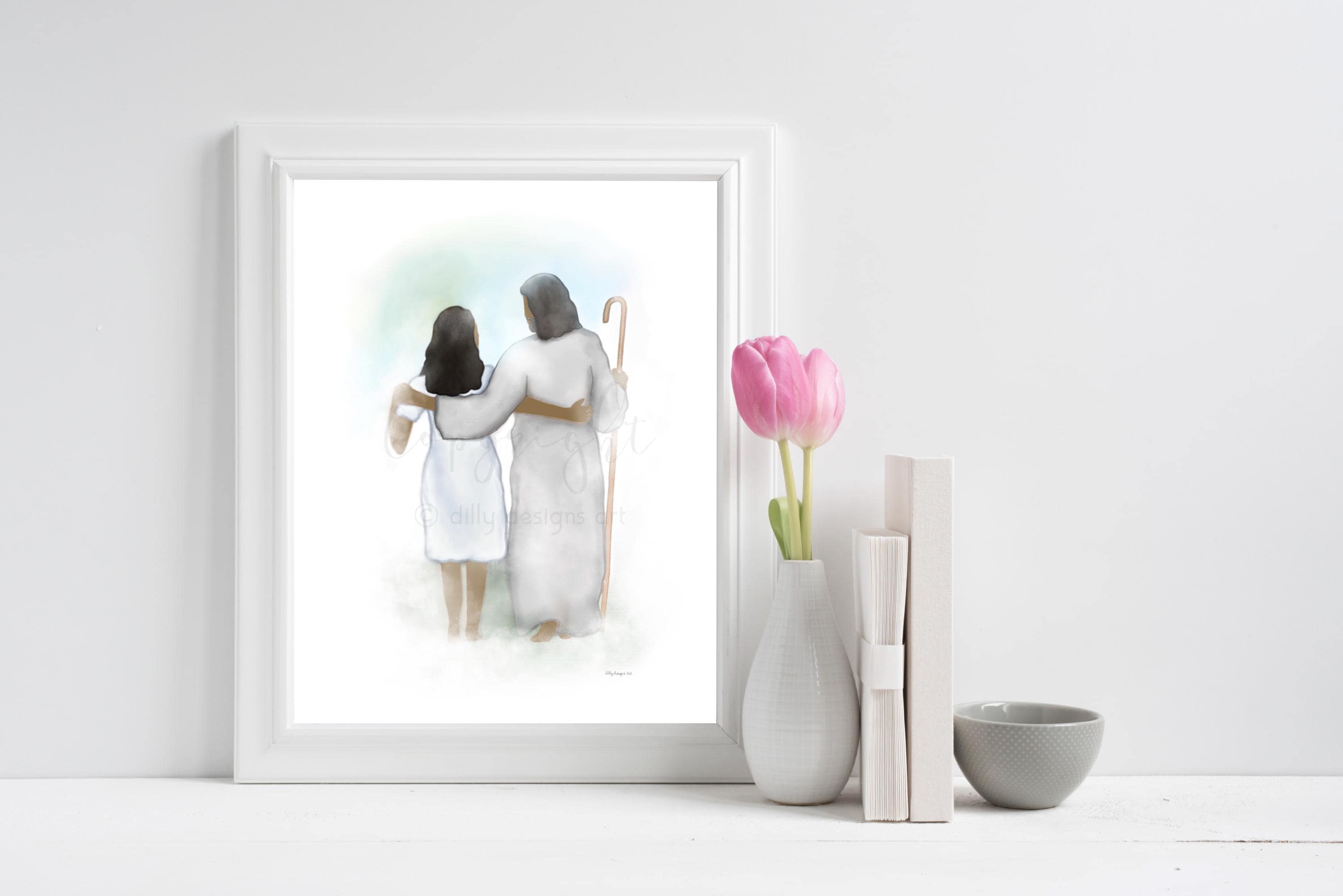 Hi there, and welcome to my shop! I’m Kamie Zamora, and I created this artwork straight from my heart. This piece means so much to me—it’s Jesus walking arm in arm with a woman, offering His love, comfort, and peace. It’s my way of expressing the constant presence of His care, especially during times when we need it most.