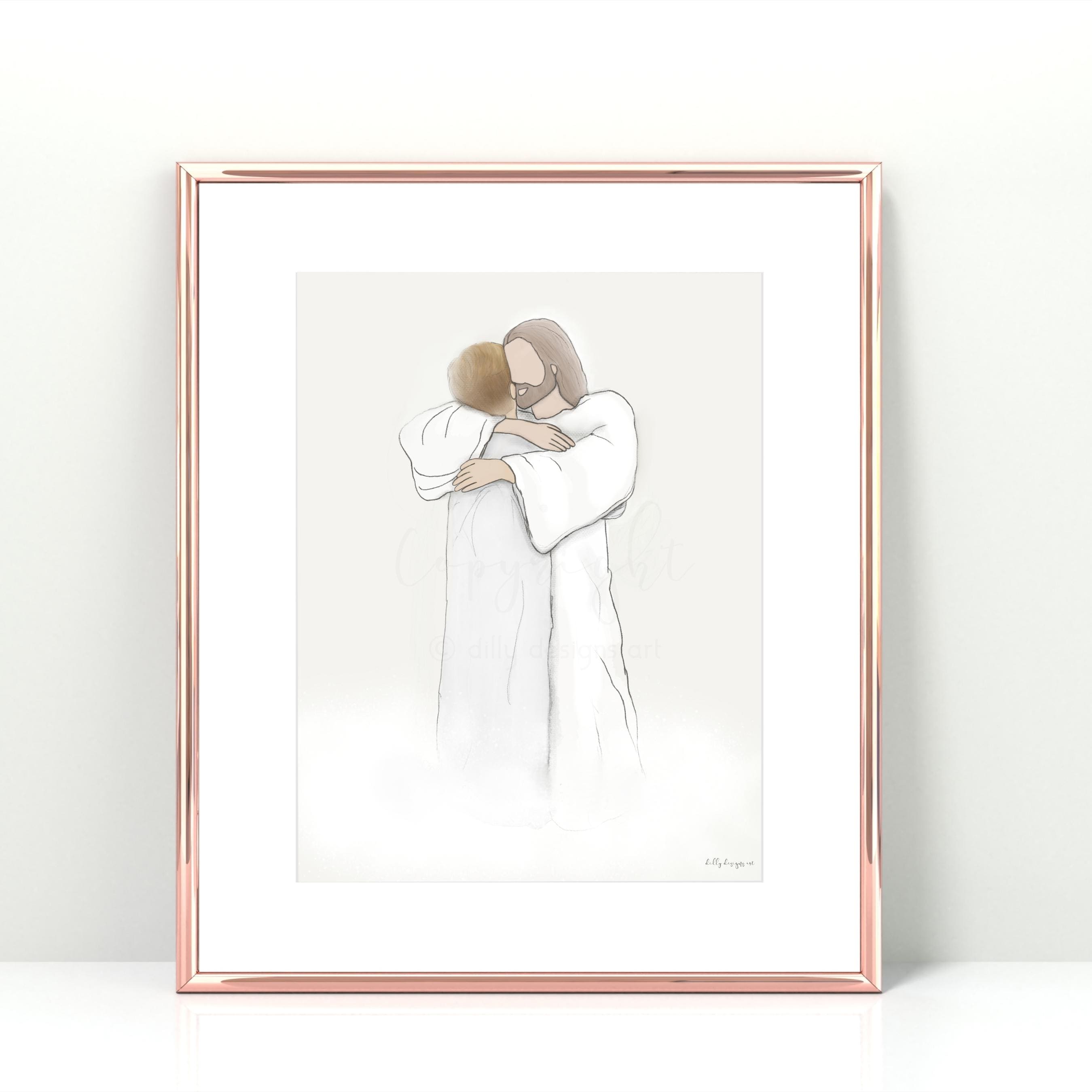 Christian printable wall art, Jesus hugging man artwork, sympathy gift, religious funeral art, comforting Christian décor, faith-based printable, loss of loved one gift, Christ embrace illustration, spiritual wall art