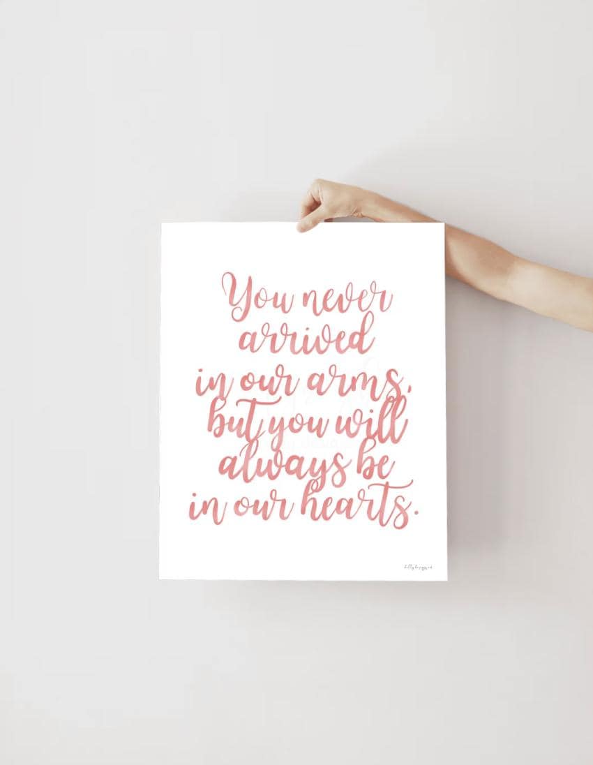 I created this piece because I wanted something gentle and comforting for families who are remembering a little life they didn’t get to hold. With the soft pink script and simple design of “You never arrived in our arms, but you will always be in our hearts,” my hope was to honor that love in a peaceful, meaningful way.